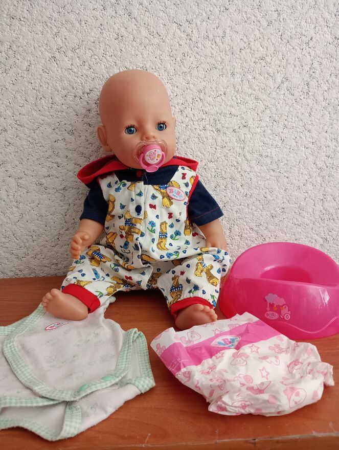 Sprzedaję lalkę baby born firmy zaft creation o wielkości 43 cm ,z elementami widocznymi na foto: nocnik, butelka , smoczek, pieluszka i kilka ubranek / firmy baby born i innych/ stan bardzo dobry/Wszystkich elementów razem z lalką jest 16.